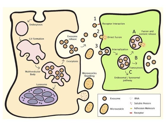 Extracellular vesicles are secreted by nearly all cells in the body, are found in all body fluids and are considered to be key components in cell-cell communication. EVs exert their effects on biological processes in a pleiotropic manner, directly activating cell surface receptors via protein and bioactive lipid ligands, merging their membrane contents into the recipient cell plasma membrane and delivering effectors including active proteins, small and large non-coding regulatory RNAs (e.g. microRNAs [miRNAs]) and mRNAs. Such wide ranging cell biological functions suggest that EVs, by virtue of their signaling ability, may have innate therapeutic potential, for example in the fields of regenerative medicine and immunotherapy.